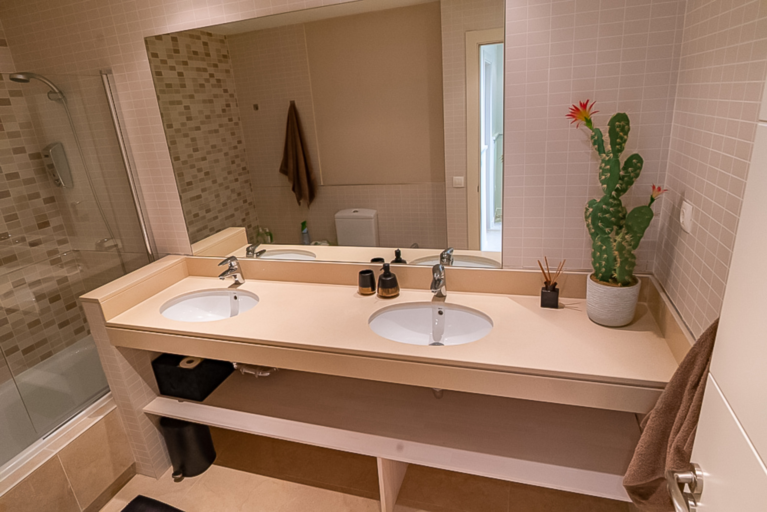 Draußen wartet eine charmante Terrasse von 20 m² mit Gartenmöbeln auf Sie, ideal zum Entspannen und Genießen der Ausblicke auf den Ozean, die Berge und den Golfplatz. Den Gästen steht auch ein gemeinsamer Pool mit den Abmessungen 7x20 Meter zur Verfügung, perfekt zur Abkühlung und zum Spielen für Kinder.