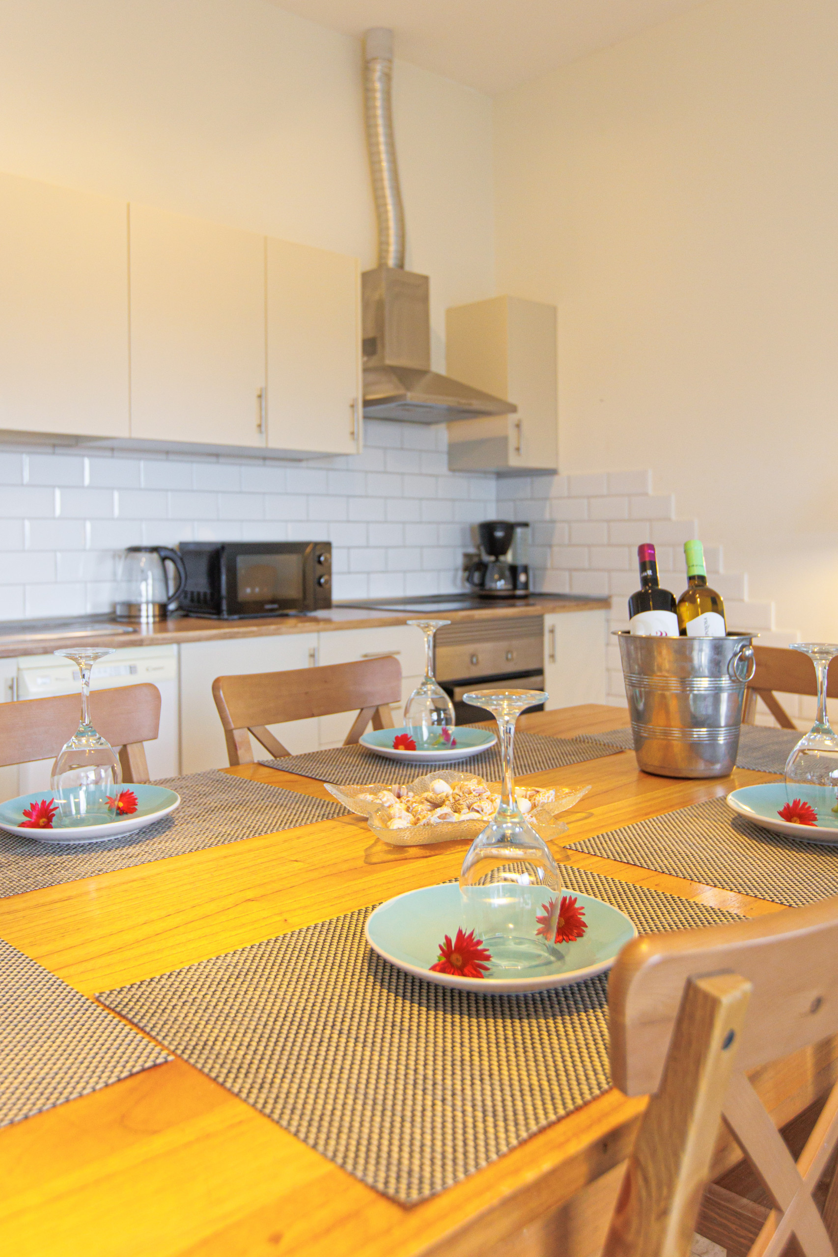 Eine voll ausgestattete amerikanische Küche ist das wahre Herzstück der Wohnung. Hier finden Sie alles, was man zum Zubereiten gemeinsamer Mahlzeiten benötigt - von Kühlschrank und Gefrierschrank bis hin zur Spülmaschine, Mikrowelle, Kaffeemaschine und einem Geschirr-Set. Zur Bequemlichkeit der Gäste wurde auch eine Waschmaschine bereitgestellt.
