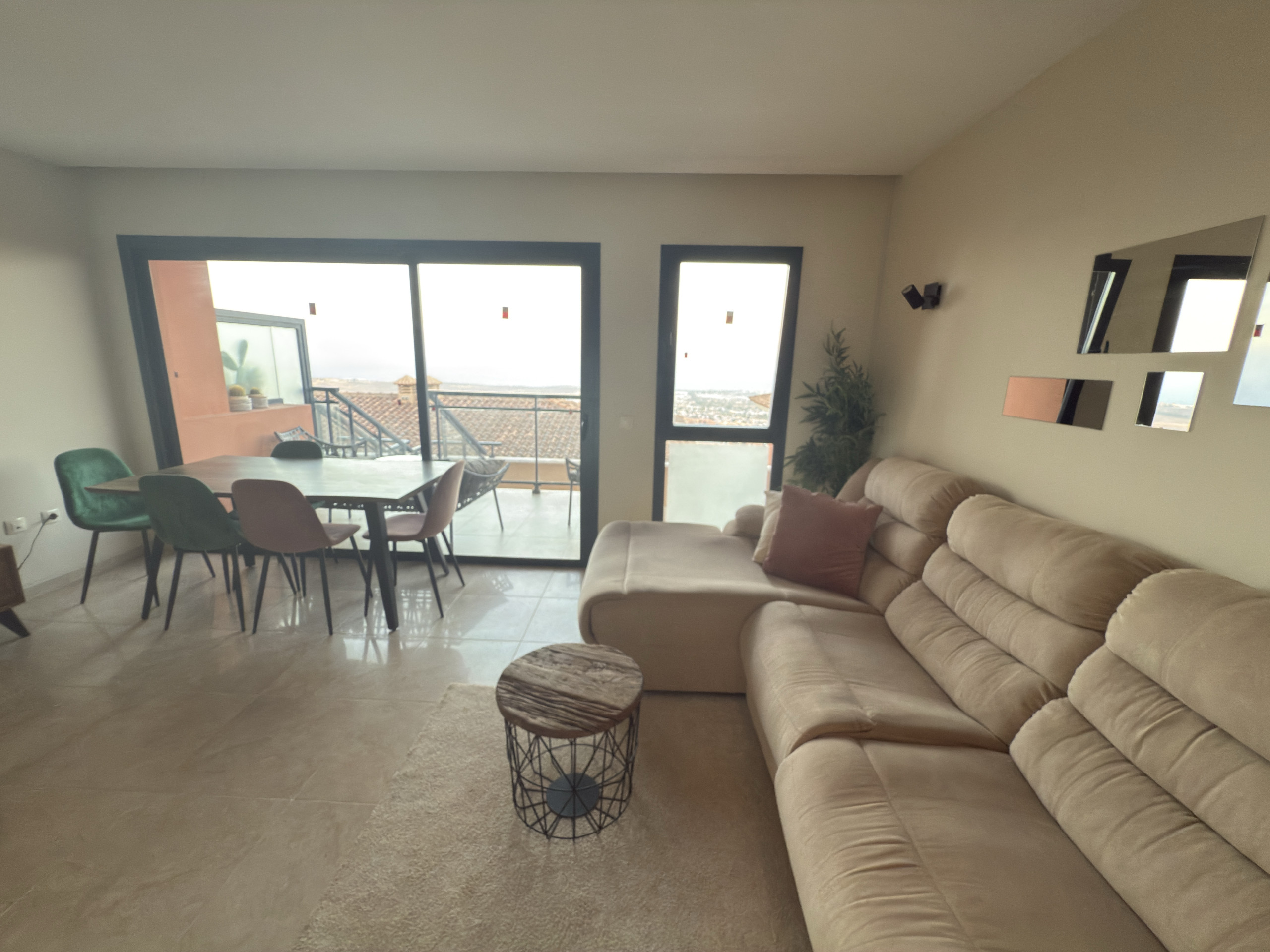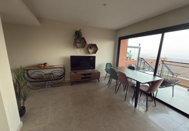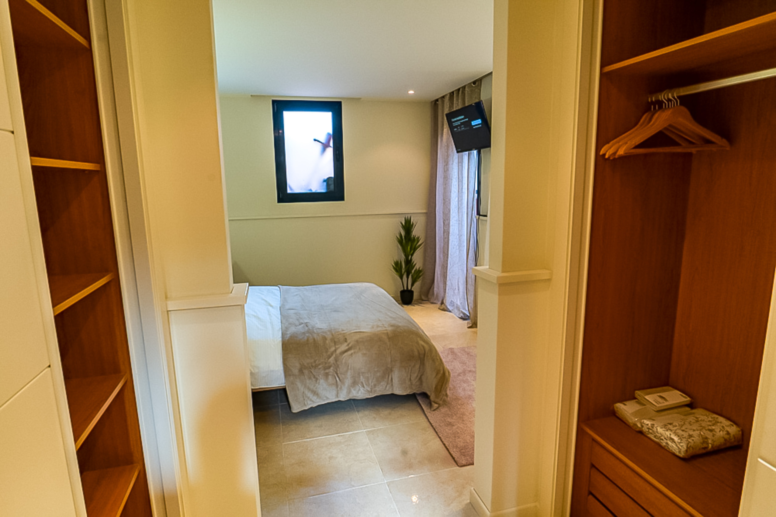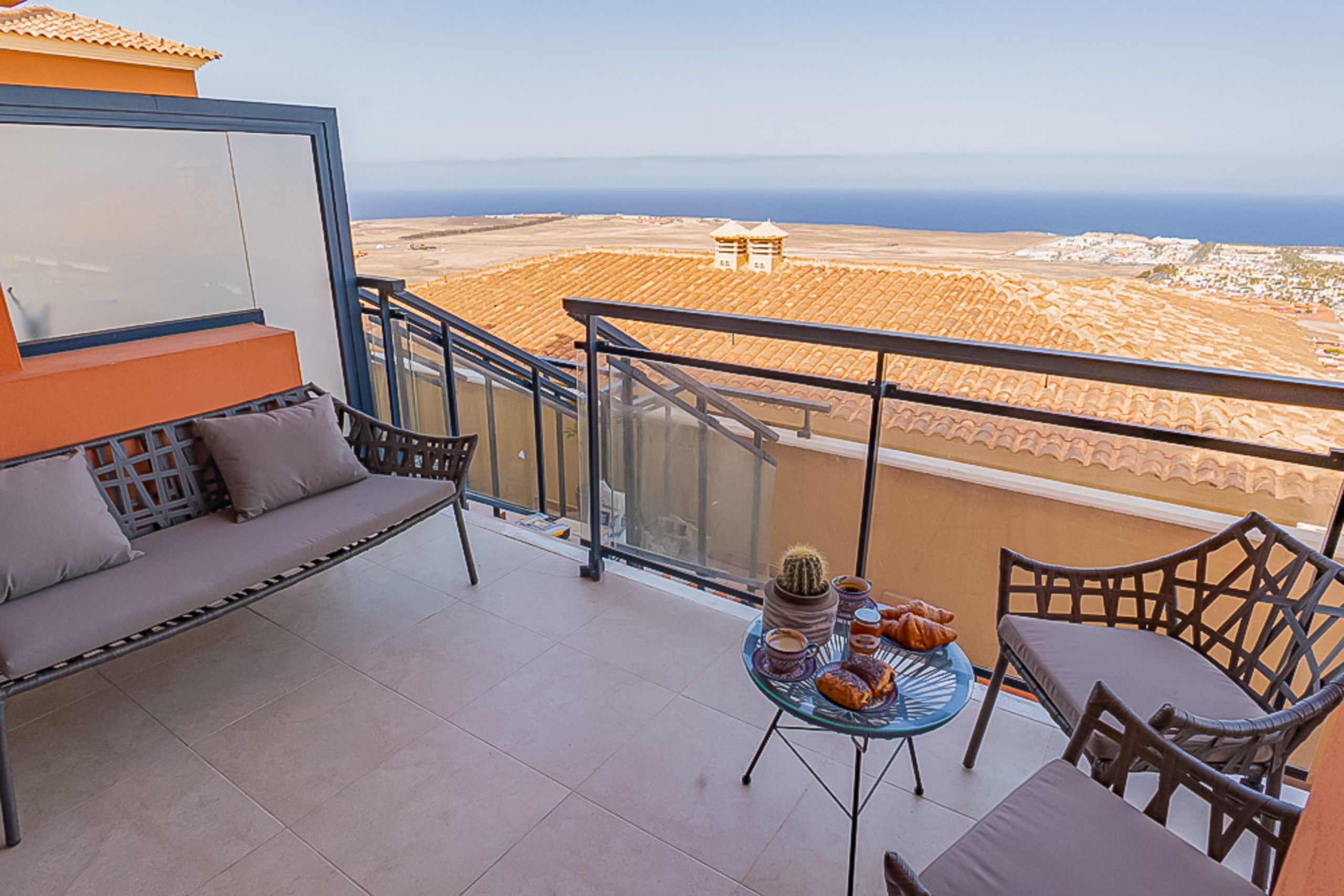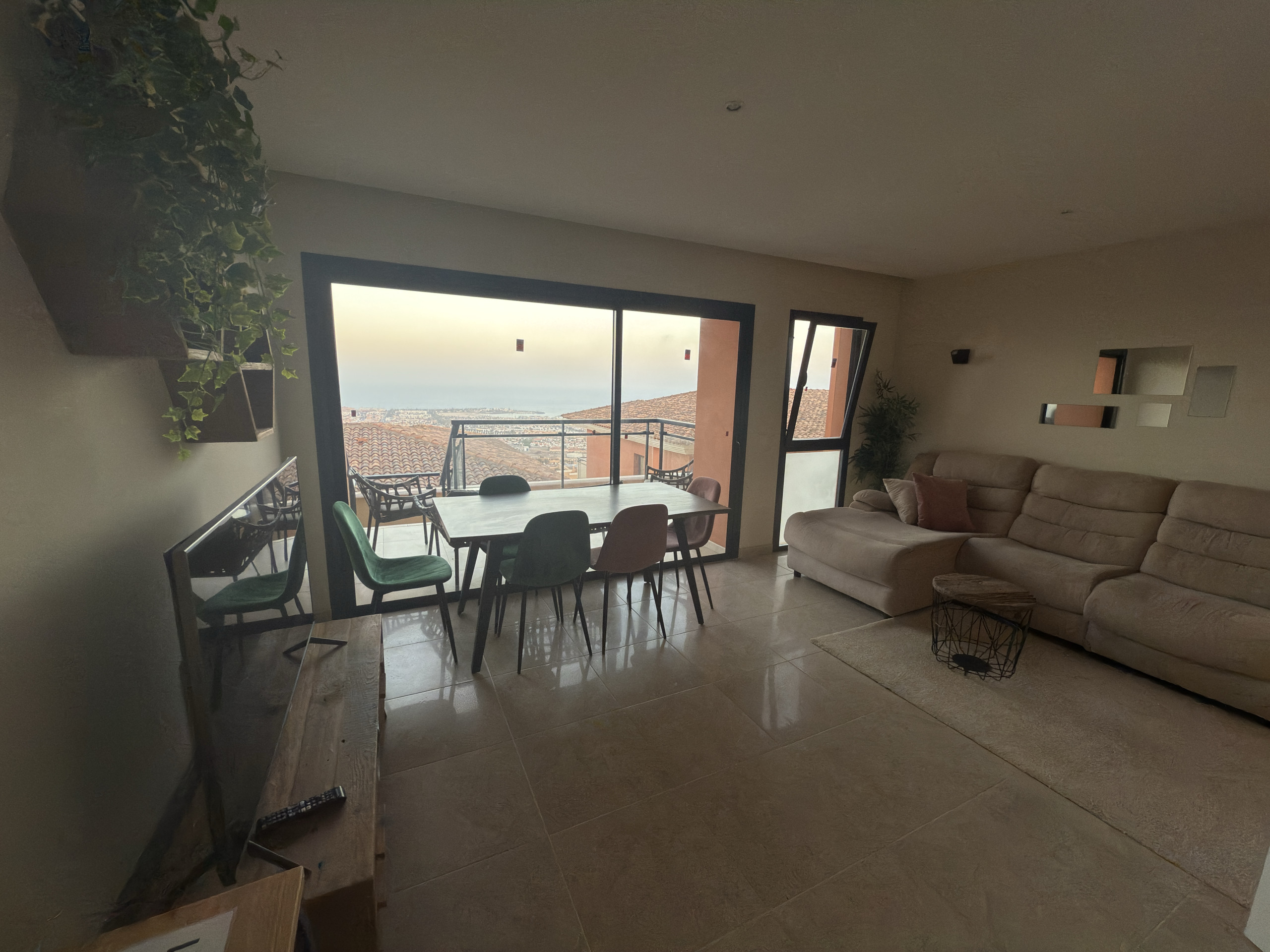 En el exterior les espera una terraza encantadora de 20 m² con muebles de jardín, ideal para relajarse y deleitarse con las vistas al océano, las montañas y el campo de golf. A disposición de los huéspedes también hay una piscina común de 7x20 metros, perfecta para refrescarse y para que los niños jueguen.