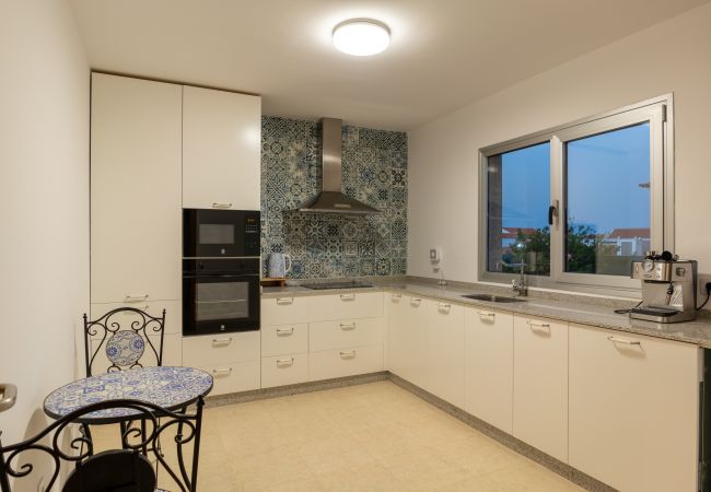 En la planta baja se encuentra un luminoso salón con ventanales panorámicos con vista al océano, sofás cómodos, un gran televisor y una mesa de comedor. La cocina moderna está completamente equipada, con lavavajillas, cafetera, horno, microondas, placa de inducción, refrigerador con congelador y juego de vajilla a disposición de los huéspedes.