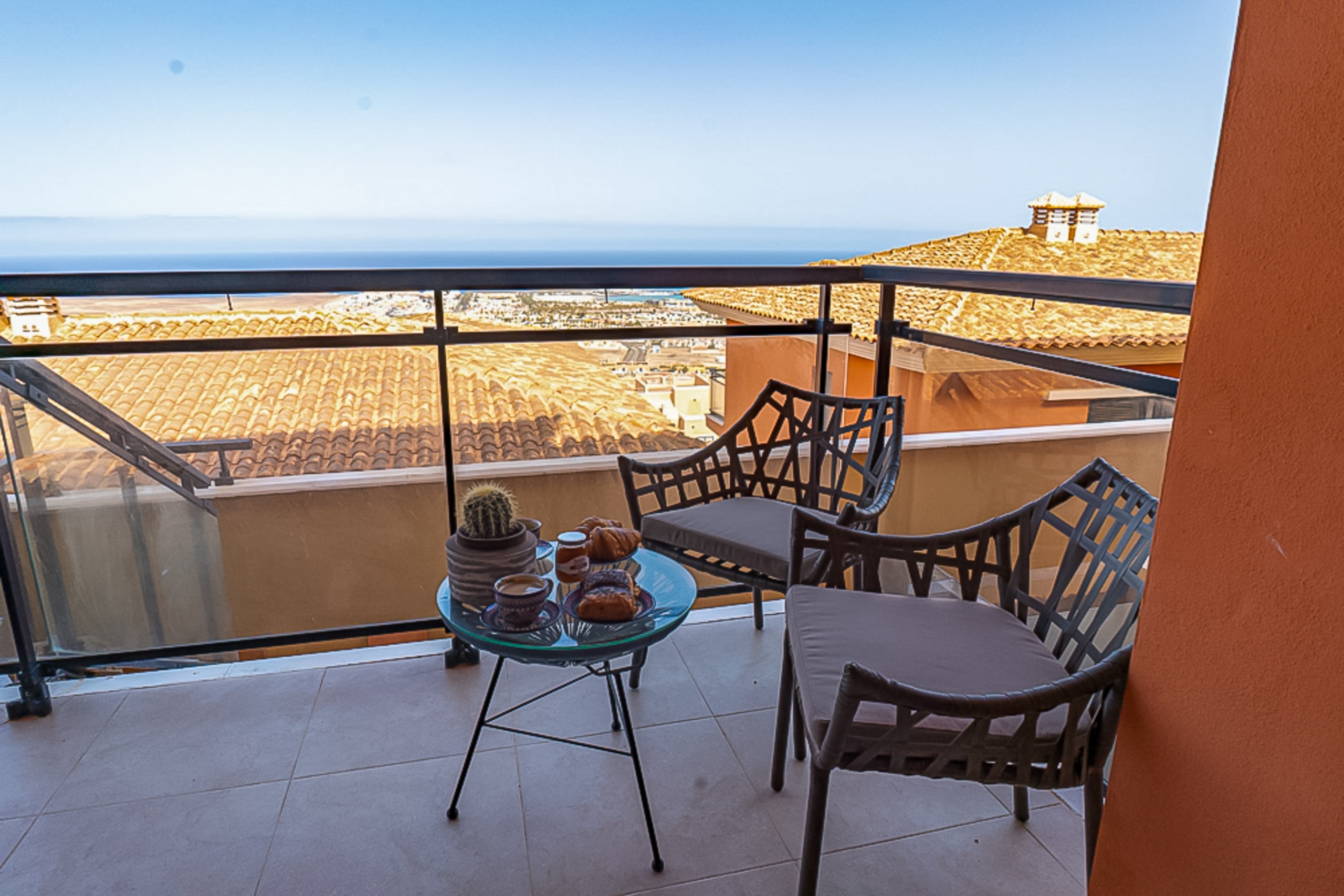 Outside, a charming terrace of 20 m² awaits you with garden furniture, perfect for relaxation and enjoying views of the ocean, mountains, and golf course. Guests also have access to a shared pool measuring 7x20 metres, ideal for cooling off and fun for children.